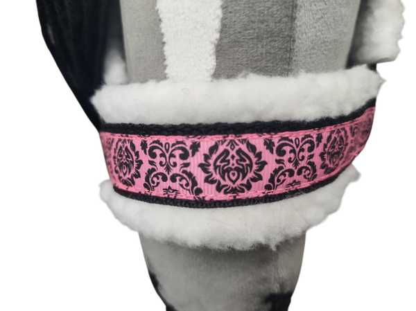 Dit mooie halster zal perfect staan op jouw hobbyhorse. Het band is onderlegd met zacht fleecebont en de neusriem is mooi versierd met een roze lint. Het halster is op twee plaatsen verstelbaar zodat het op vrijwel alle hobbyhorses past. Er zit een bijpassend zwart halstertouw bij. Kortom, een mooie complete set waar er maar één van is!