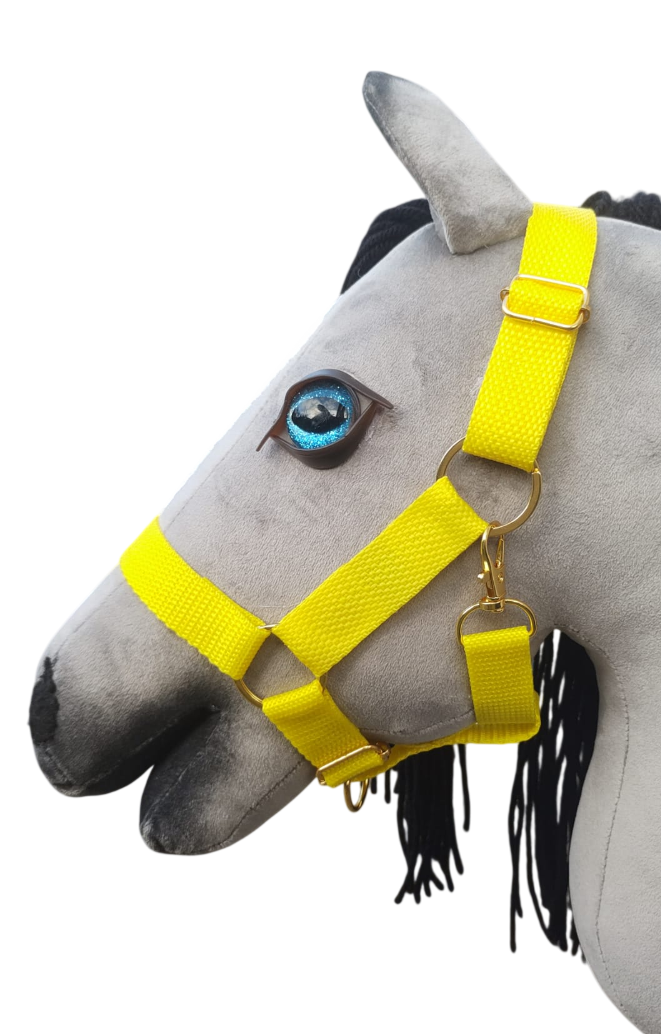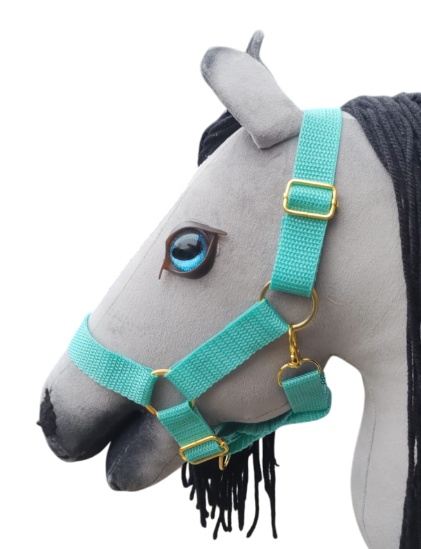 Een fijn en simpel halster van nylon band met een schuifgesp op het kopstuk en onder de kaak. Hierdoor past het halster op vrijwel alle hobbyhorses (ook de LeMieux paardjes).