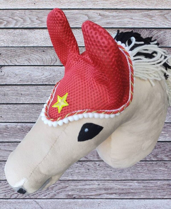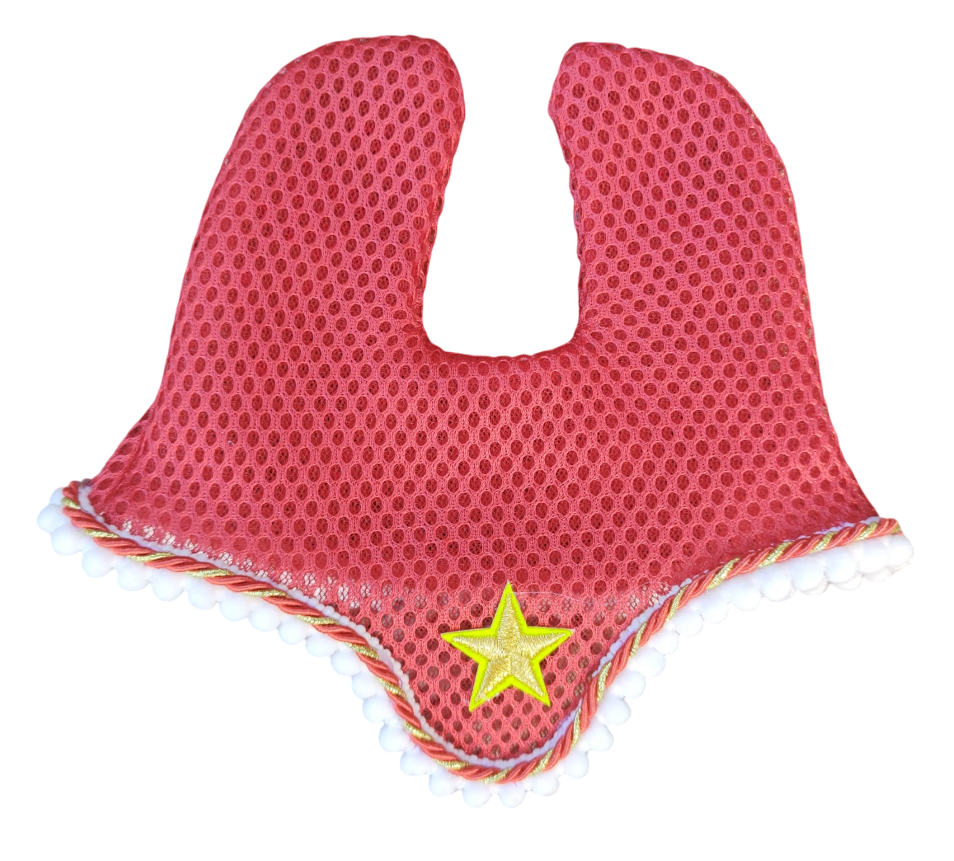 Dit mooie oornetje voor je hobbyhorse is gemaakt van fijne rekbare meshstof. Naast dat dit een beetje lijkt op een gehaakt oornetje, past het ook door de rekbaarheid op vele maten hobbyhorses. Het heeft een mooie pasvorm. De rand is afgezet met een leuke bolletjesband en een bijpassend sierkoord. De ster op de voorkant maakt het helemaal af!